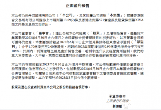 据悉,佐丹奴今年半年度预计获得净利润1.7亿港元至2亿港元,较去年同期增长75%至106%。净利润激增的主要原因为销售改善、毛利率提升以及经营费用的控制。此外,其三大主要市场(大中华、东南亚、海湾阿拉伯国家合作委员会)的销售和利润均在增长。