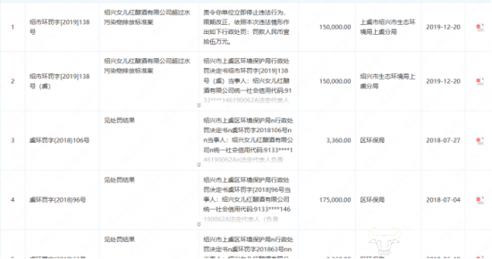 但值得注意的是,女儿红所属公司绍兴女儿红酿酒有限公司在近些年来曾多次因为环保问题被罚,罚款已累计61.56万元。