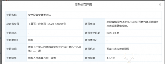 据悉,华北制药华胜有限公司是华北制药旗下子公司,华北制药持有其52.26%股份。处罚信息显示,公司地埋罐区编号为9611004002的可燃气体探测器外壳未设置静电接地,违反相关法律,构成安全设备安装类违法行为。