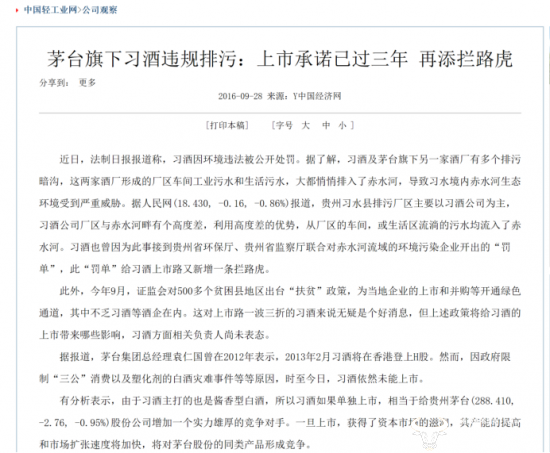 根据媒体报道称,习酒多年前曾因环境违法被公开处罚。
