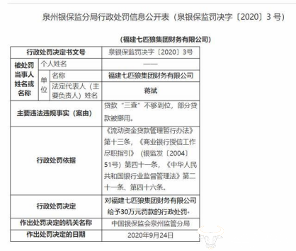 值得注意的是,2020年9月,中国银保监局福建分局官网公布行政处罚信息(泉银保监罚决字〔2020〕3号),福建七匹狼集团财务有限公司因贷款“三查”不够到位、部分贷款被挪用被给予罚款30万元的行政处罚。不知周少明对此事有何看法?
