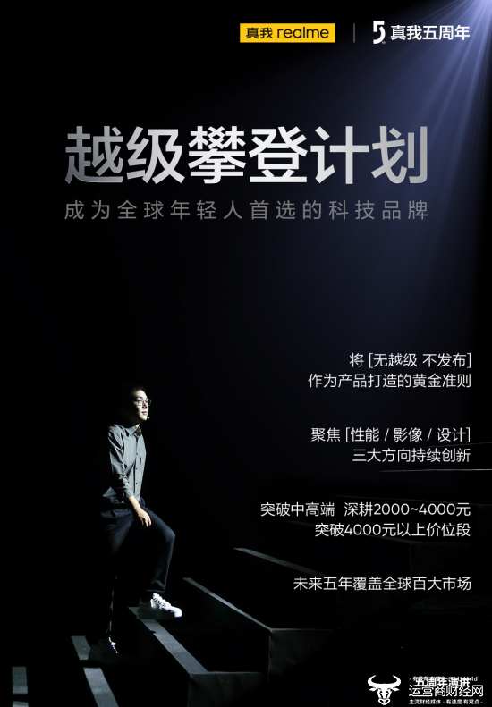 五周年演讲上,徐起宣布真我下一个五年的「越级攀登计划」:成为全球年轻人首选的科技品牌;将“无越级,不发布”作为产品打造的黄金准则;围绕“性能、影像、设计”三大方向进行技术创新;深耕2000-4000价位段并突破中高端;未来五年覆盖全球百大市场。