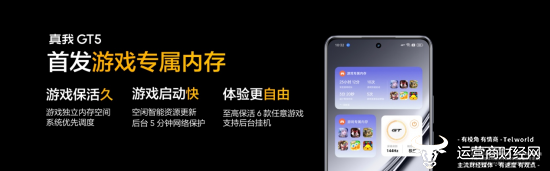 作为行业大内存引领者,真我GT5持续引领满级内存体验升级,配备行业天花板级的24GB+1TB 满级内存组合。在顶级参数之上,真我GT5还将首发游戏专属内存,引领内存体验的革新。用户至多可将6款游戏放入专属内存中,实现常驻保活,随点随开,告别游戏重复加载。