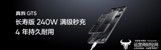 真我GT5 延续此前240W满级秒充规格,满级之上再升级。真我GT5搭载SUPERVOOC S全链路电源管理芯片,可实现目前行业最高的99.5%的放电效率。240W满级秒充搭配99.5%的放电效率,真我GT5实现行业充放电双极限。与此同时,真我GT5支持长寿版 240W 满级秒充,可以实现4年耐久使用。