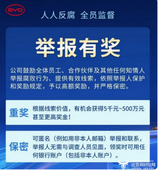 日前,比亚迪审计监 察处公告显示,公司鼓励全体员工、合作伙伴及其他任何知情人举报腐败行为、提供有效线索,依照举报人保护和奖励规定,予以高额奖励,并严格保密。