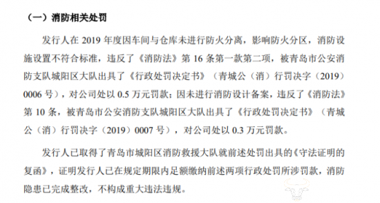 据资料显示,在左克利还未当上公司副总的时候,公司曾因为车间与仓库未进行防火分离,影响防火分区,消防设施设置不符合标准而违反了相关规定,被青岛市公安消防支队城阳区大队出具了《行政处罚书》,公司被处以0.3万元罚款。不过在左克利上任后,目前还未有此类事件发生。
