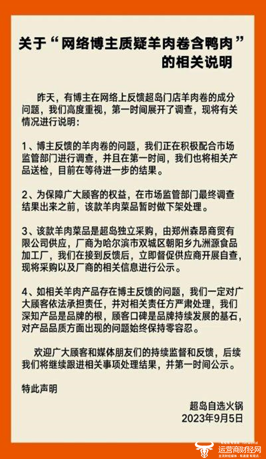 针对该博主发布的信息,超岛方表示正在积极配合市场监管部门进行调查,并且声明这款羊肉菜品是超岛独立采购,由郑州森昂商贸有限公司供应的,还贴出了该公司的承诺声明,表示其供给的羊肉是纯羊肉,不掺杂其他肉质。