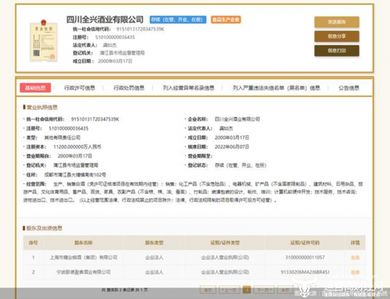 去年6月,宁波歌德盈香酒业有限公司代替成都工慧投资咨询有限公司、成都金瑞通实业股份有限公司两位股东,成为了公司第二大股东,认缴额3696万元,持股33%。