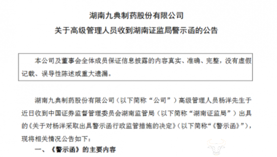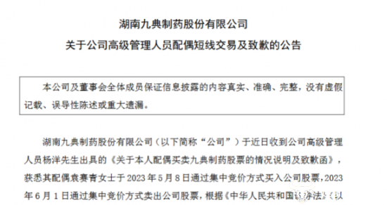 前不久,九典制药发布公告称,副总经理杨洋因其配偶短线交易公司股票获益4万多,收到湖南证监局出具的《警示函》。据悉,他在收到警示函的前一个月还曾就此事公开致歉。