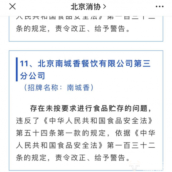 值得注意的是,近期,北京南城香餐饮有限公司第三分公司因为存在未按照要求进行食品贮存的问题,违反了食品安全法相关条例,被市场监管局点名,并责令整改和给予警告。