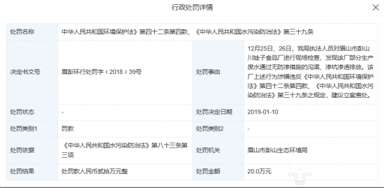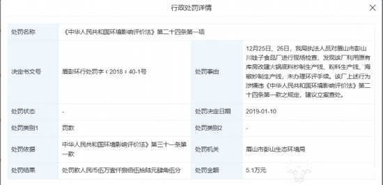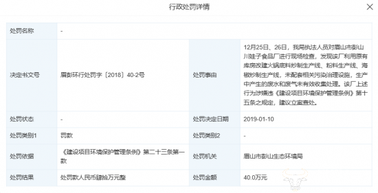 但值得注意的是,据天眼查显示,在2019年1月,彭山川娃子食品厂因利用原有库房改建火锅底料炒制生产线、粉料生产线、海椒炒制生产线,未配套相关污染治理设施,生产中产生的废水和废气未有效收集处理,被眉山市彭山生态环境局罚款40万元。