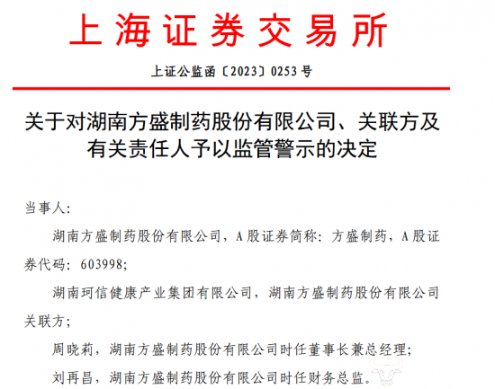 因此,上交所对方盛制药和关联方湖南珂信,以及周晓莉、刘再昌予以了监管警示。