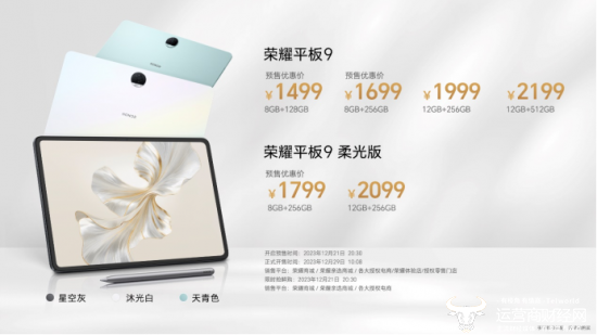 荣耀平板9共推出8GB+128GB、8GB+256GB、12GB+256GB、12GB+512GB四个版本,预售优惠价1499元起。荣耀平板9柔光版推出8GB+256GB、12GB+256GB两个版本,预售优惠价1799元起。2023年12月21日20 : 30开启预售,2023年12月29日10 : 08正式开售。用户届时可前往荣耀商城/荣耀亲选商城/各大授权电商/荣耀体验店/授权零售门店进行选购。