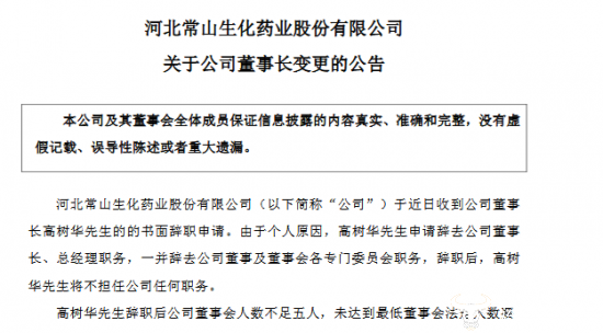 当年5月14日,常山药业发布关于公司董事长变更的公告,称高树华提请书面辞职报告,申请辞去公司董事长、总经理职务,同时一并辞去公司董事及董事会各专门委员会职务,辞职后,他将不再担任公司任何职务。与此同时,常山药业宣布选举高晓东为董事长,以及代理行使总经理及董事会秘书的职责。