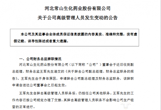 还值得注意的是,蔡浩并不是常山药业后半年来第一位高管变动人员。前不久,常山药业在11月7日时还发布一则关于公司高级管理人员发生变动的公告,公司副总经理、财务总监王军因身体原因申请辞职,由岳晓华来接替王军的职位。