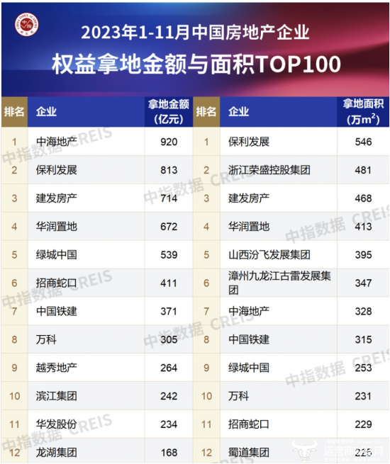 据中指研究院数据显示,今年前11月,万科权益拿地金额305亿元,排名行业第八;权益拿地面积231万平方米,排名第十。
