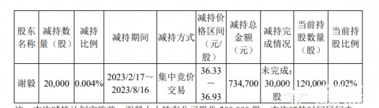 而在今年全年,谢毅通过集中竞价的方式减持了公司2万股股份,减持总金额达到了73.47万元。据公司8月16日发布的公告显示,谢毅当前持股数量为12万股,持股比例为0.02%。