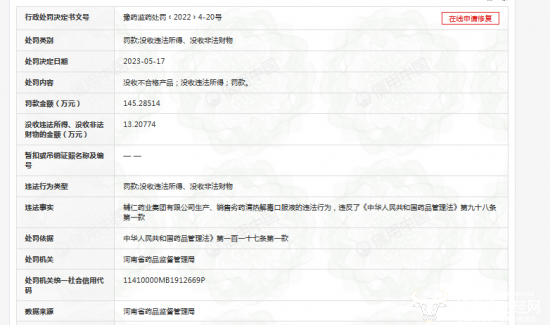 运营商财经网从信用中国获悉,辅仁药业因生产、销售劣药清热解毒口服液,违反了相关法律法规,被河南省药品监督管理局于2023年5月17日罚款145万多,并没收违法所得13万多,共计158万元。