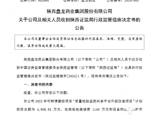 1月12日,盘龙药业发布一则收到行政监管措施决定书的公告,内容显示,盘龙药业、公司董事长兼总经理谢晓林、董事会秘书吴杰于近日收到中国证券监督管理委员会陕西监管局出具的行政监管措施决定书。