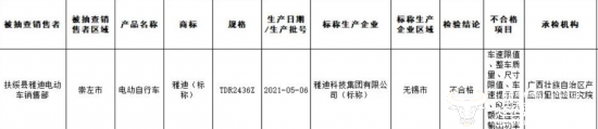 4月7日,广西壮族自治区市场监督管理局发布《自治区市场监管局关于2022年润滑油等68种产品质量广西监督抽查情况的通报》,其中雅迪1款车型在车速限值、整车质量、尺寸限值、车速提示音、电动机额定连续输出功率等项目抽检不合格。
