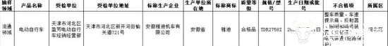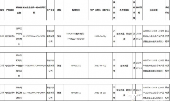 1月11日,烟台市市场监督管理局发布《2022年第一批产品质量市级监督抽查结果公示》,雅迪科技集团有限公司生产的3款电动自行车在整车质量和鞍座长度等项目抽检不合格。