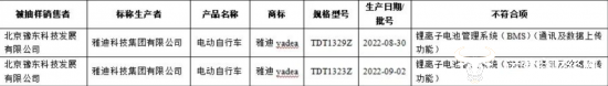 1月29日,北京市市场监督管理局发布《北京市电动自行车产品质量监督抽查结果公示(2022年第2批)》,雅迪科技集团有限公司生产的2款电动自行车在锂离子电池管理系统(BMS)(通讯及数据上传功能)方面不合格。。