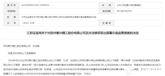 此外,2023年5月25日,孙洁晓再次收到江苏证监局警示函,指出公司未在2016年至2020年定期报告中披露与实际控制人孙洁晓相关的承诺事项及具体履行情况。