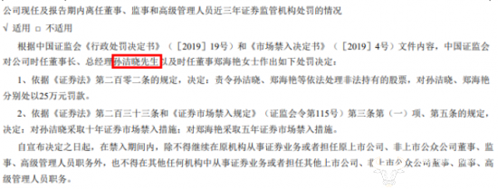 值得一提的是,2019年3月13日,时任董事长孙洁晓与时任董事郑海艳收到《中国证监市场禁入决定书》及《行政处罚决定书》。孙洁晓被罚款25万元,禁入证券市场10年;郑海艳被罚款25万元,禁入证券市场5年。