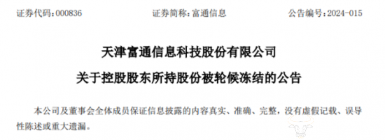 本次轮候冻结股份数量约为1.44亿股,占其所持股份比例100%,占公司总股本比例11.92%,这已经是富通科技2024年第二次被轮候冻结了。