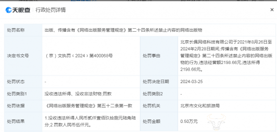 据天眼查披露的行政处罚信息显示,公司于2021年8月26日至2024年2月28日期间,传播含有《网络出版服务管理规定》第二十四条所述禁止内容的网络出版物的行为,被北京市文化和旅游局罚款0.5万并没收违法所得2198.66元。