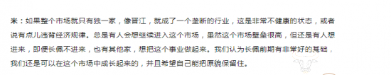 2021年,刘潇和杨茗接受了某媒体采访,刘潇曾表示:如果整个市场就只有独一家,像晋江,就成了一个垄断的行业,这是非常不健康的状态,或者说有点儿违背经济规律。杨茗也在回答为什么部分作者选择在长佩开文时曾表示“晋江榜单模式对未签约作者不是特别友好”。