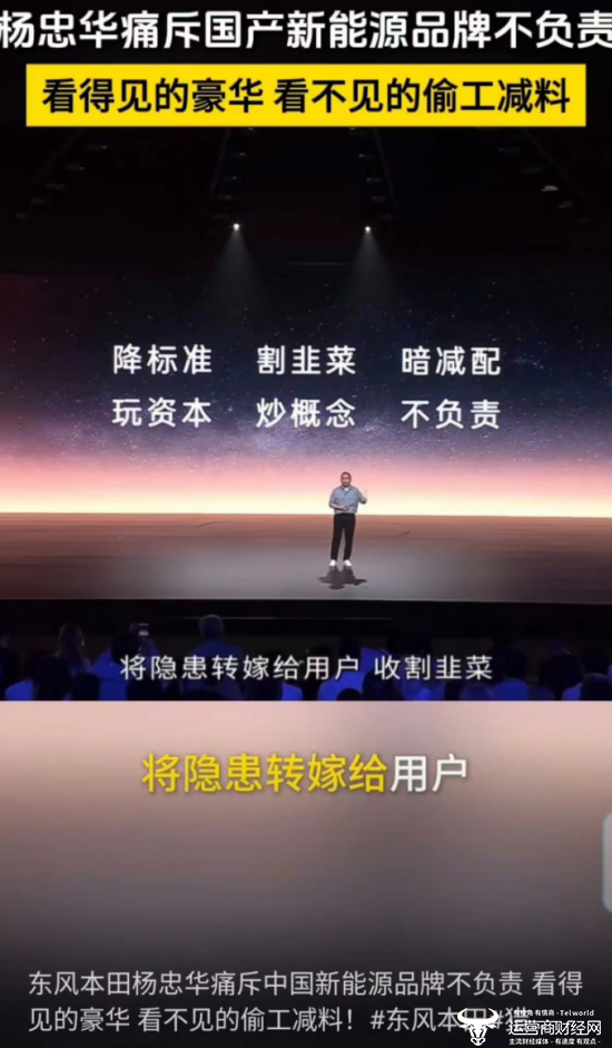 他还指出一些新能源品牌冰箱、彩电、大沙发等豪华配置一应俱全,在消费者看不见的地方却使用廉价替代品偷偷减配,言语之间透露出他对新能源汽车市场乱象的不满。