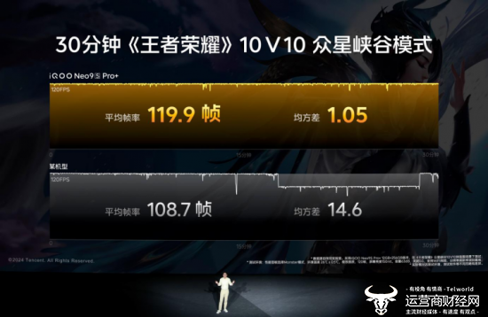 一款性能强大、能耗表现优异且面对高温、重载游戏场景依旧可以稳定、冷静输出的手机,无疑才是游戏玩家心中的“夏日梦想机”。iQOO Neo9S Pro+所搭载的第三代骁龙 8 旗舰芯片与自研电竞芯片 Q1 可谓兼顾性能和能效比的优秀旗舰芯组合,辅以6K天幕VC液冷散热系统,即使长时间重载游戏也能保证始终如一的稳定流畅表现。以《王者荣耀》众星峡谷10V10超重载玩法和35℃高温下玩《王者荣耀》120帧高清模式为例,iQOO Neo9S Pro+半小时游戏平均帧率接近满帧且帧率稳如直线,制霸手机游戏性能赛道。