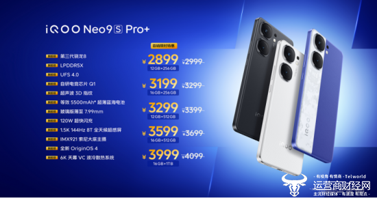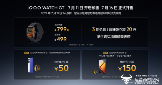 iQOO Neo9S Pro+共有Buff蓝、星曜白和格斗黑三种配色,提供12GB+256GB、12GB+512GB、16GB+256GB、16GB+512GB和16GB+1TB存储组合可选,到手价2899元起;iQOO WATCH GT eSIM版售价799元起,蓝牙版499元,7月11日—7月22日下单蓝牙版立减20元,到手价仅需479元; iQOO Pad2 Pro到手价 3299元起;iQOO TWS 1i售价 99元,与iQOO Neo9S Pro+组合购买可享至高40元优惠,到手仅需59元。