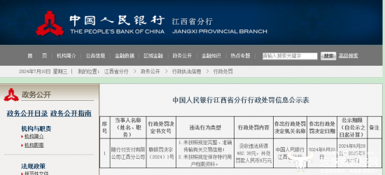 近期,中国人民银行江西省分行披露一则行政处罚信息,根据行政处罚决定书《赣银罚决字〔2024〕1号》,随行付支付有限公司江西分公司因未按照规定完整、准确传输有关交易信息;未按照规定保存特约商户档案资料,违反了相关法律法规。
