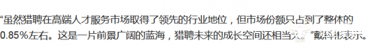 还值得一提的是,2018年,在猎聘上市之际,戴科彬曾表示:“虽然猎聘在高端人才服务市场取得了领先地位,但市场份额只占到了整体的0.85%左右。这是一片前景广阔的蓝海,猎聘未来的成长空间还相当大”。但后来在2020年接受某媒体采访时,戴科彬又表示,于猎聘而言,我们在国内中高端人才获取市场的市占率是第一,不知有何依据呢?
