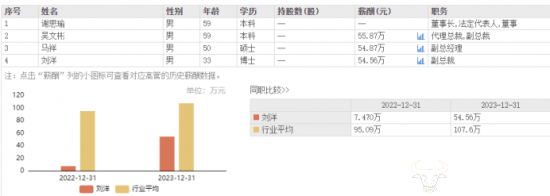 东方财富网显示,刘洋在2022年取得了7.47万元的薪酬。不过刘洋是在2022年10月份才上任的副总裁,其薪酬也是从那时候开始计算的。在其上任之后的第一个完整年,刘洋在2023年的薪酬为54.56万元,与公司其他高管几乎没什么差距。