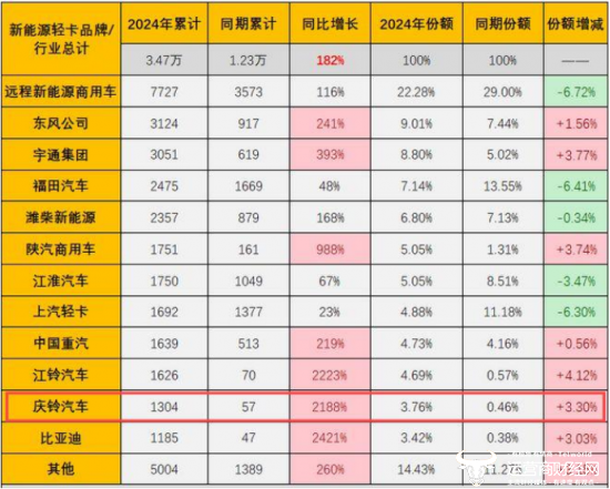 数据显示,2024年上半年庆铃汽车新能源轻卡的销量为1304辆,虽然不算很高,但同比增长高达2188%,其市场份额也增长了3.3%。运营商财经网将持续关注庆铃汽车未来的发展情况。