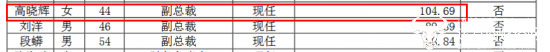 2023年,高晓辉从公司获得税前报酬总额为104.69万元,相较2022年涨薪了31.69万元,她的年薪也比其他副总裁高,其中比段蟒高出65.85万元。