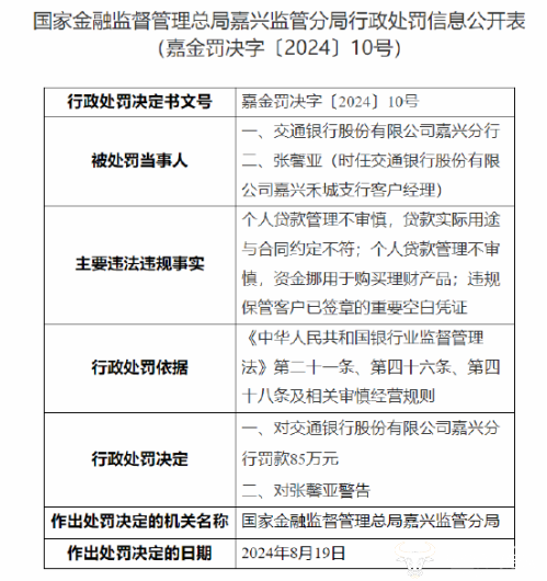 8月28日,国家金融监督管理总局嘉兴监管分局公开了行政处罚信息。交通银行股份有限公司嘉兴分行因存在三项违法违规事实,被处以85万元的罚款。
