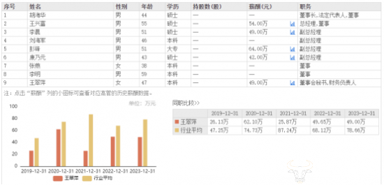 最近几年,除了2021年大幅下降外,王翠萍的薪酬一直很稳定,2020年至2023年,其薪酬分别为62.10万元、25.87万元、49.65万元、49万元。