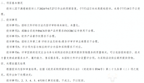 而长沙电信则是针对采购方和采购代理人进行了六项投诉。其称招标文件评标方法内容评审标准未细化、未量化;超融合系统和PACS存储产品所要求的CCRC证书使用不合理;软件产品著作权要求不合理;招标文件第三章评标方法及标准-商务评审评审业绩要求不合理。