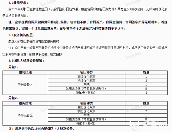 团队配置要求参选人在每个服务区域均设有1为高级优化专家、2位初级优化专家,还要配备有1台车辆,8台5G测试终端(待专业测试软件)以及4个测试卡(移动)。