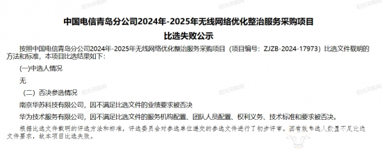 近日,青岛电信2024年-2025年无线网络优化整治服务采购项目发布比选失败公告,华为技术服务有限公司竟然也被否决参选,具体是什么情况?