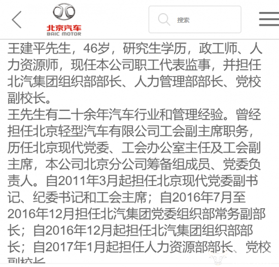 据了解,王建平已经在汽车行业从业二十余年,先后担任过北京轻型汽车有限公司工会副主席、北京现代工会办公室主任及工会副主席、北京汽车股份有限公司北京分公司筹备组成员等,积累了丰富的管理经验。