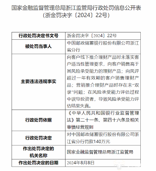 值得一提的是,8月8日,邮储浙江省分行因“向客户线下推介理财产品时未落实客户适当性管理要求,向客户销售高于其风险承受能力的理财产品;向风评超过一年有效期的客户销售理财产品;营销推介理财产品时存在未“双录”问题;在风险承受能力评估过程中误导投资者,导致风险承受能力评估结果失真”等违法事实被浙江监管局罚款140万元。