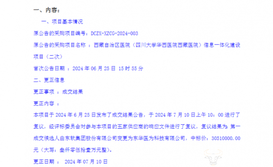 然而,该项目的招标到此并没有结束。7月11日,中国银行西藏分行再次发布公告称,经过7月10日的复议,评标委员会对参与项目的五家供应商的响应文件进行复议,结果为第一成交候选人由东软集团股份有限公司变更为东华医为科技有限公司。