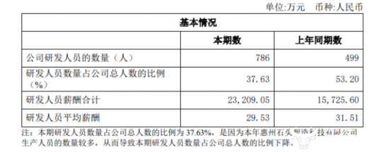 不仅如此,公司的研发人数较去年同期增加不少,这一年多了287人,薪酬合计也增加不少,然而研发人员的平均薪酬略有下降。