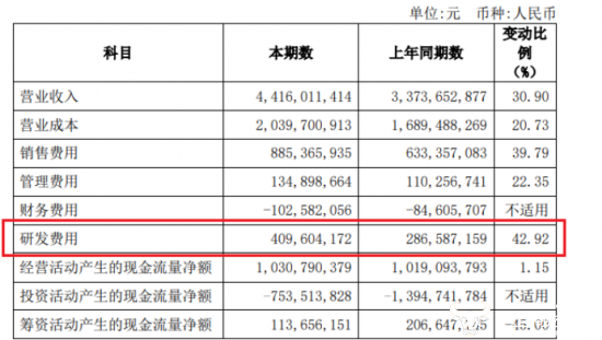 通过对财报的分析,公司上半年支出最多的数据是研发费用,由上年同期的2.86亿元上涨到今年的4.09亿元,占总营收的9.28%,同期上涨42.92%,上涨幅度较大,研发费用呈高速增长状态,看来公司十分重视研发。