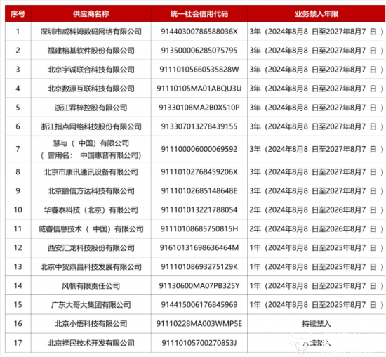 公告表示,根据《中国联通供应商黑名单管理办法》(中国联通集团〔2021〕150 号)相关规定,2024 年 8 月 8 日,经集团公司总经理办公会议审议决定,在集团公司范围内对 17 家供应商采取禁入措施,对 7 家供应商采取限制措施,禁入及限制时间自 2024 年 8 月 8 日起计算。
